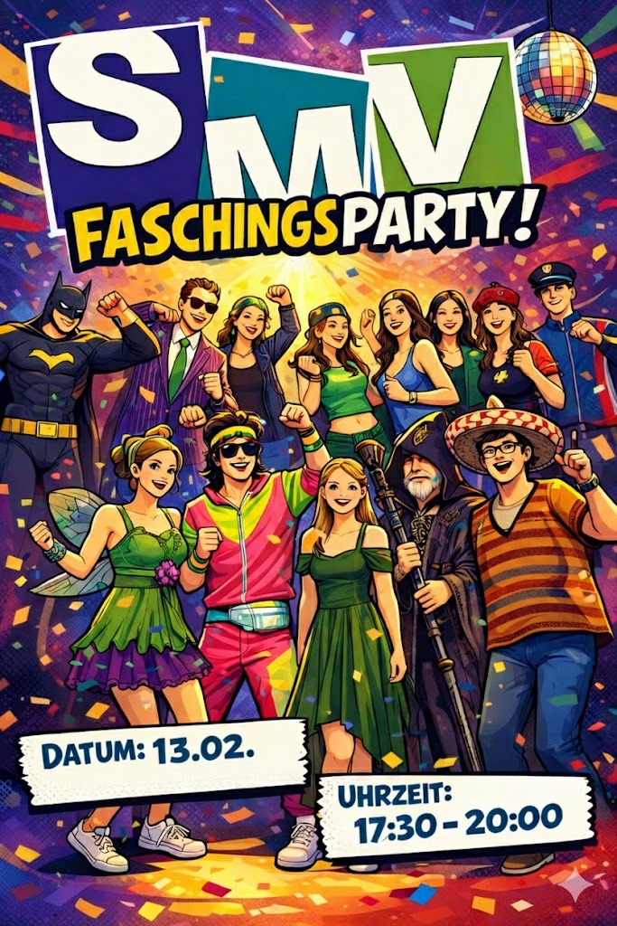 Am 13.02.2026 verwandelte sich unsere Schule von 17:30 bis 20:00 Uhr in eine fröhlich-bunte Faschingswelt. Zahlreiche Schülerinnen und Schüler erschienen in kreativen und fantasievollen Kostümen und sorgten für eine ausgelassene Stimmung.